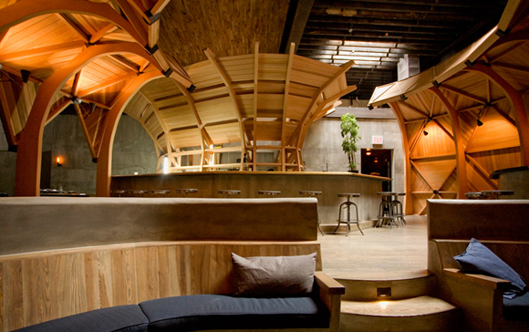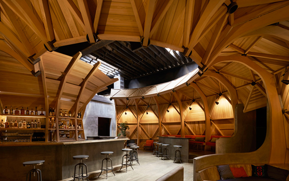 В мультидисциплинарном центре дизайна в Уильямсбурге Нью-Йорк сидит геодезическая структура правлений древесины и составляющих мозаику структур, формируя прекрасную основу для нового бара и пространство событий для хипстеров.