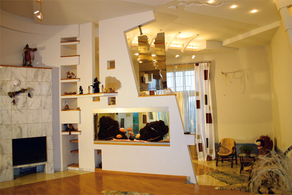 В оформлении гостиной особое внимание уделено организации пространства средствами конструктивного декора. Обширное пространство разделено фигурной гипсокартонной стеной с вмонтированным в нее большим аквариумом на гостиную и столовую. Помещение получилось солнечным благодаря большому количеству оконных проемов и хорошо продуманному освещению. Обеденный стол, барная стойка с аквариумом, камин, домашний кинотеатр и мягкая мебель потребовали разделения на мини-зоны. Этот вопрос удалось решить с помощью светового зонирования. Над сложным в плане помещением гостевой зоны, разделенной фигурной стеной – такой же сложный потолок, пунктирно подсвеченный встроенными лампами и висячими светильниками. Свет комплексный, позволяющий освещать каждую зону отдельно и все помещение в целом. Все криволинейные поверхности потолка и стен, а также ниши смонтированы из гипсокартона на каркасе. Примечательно, что декоративные приемы, вносящие в интерьер атмосферу торжественности, функциональны и являются элементами несущих конструкций.