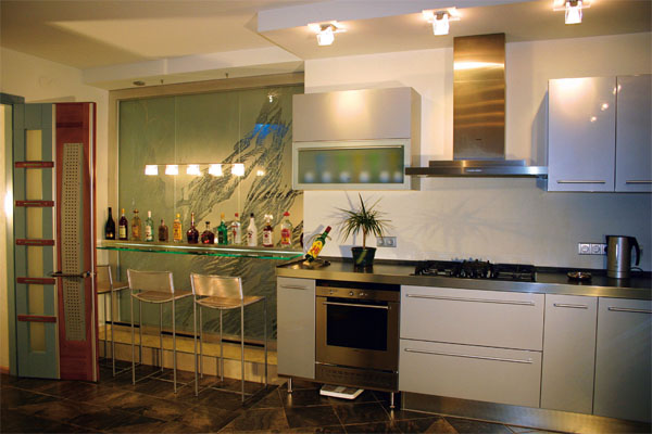 Дверь из столовой ведет в помещение кухни, в оформлении которой предпочтение отдано функционализму. В декоре кухни использована достаточно необычная деталь – подсвеченная со стороны цокольного этажа стеклянная стена, имитирующая окно с нарисованным на нем растительным орнаментом. Расположенная возле стены барная стойка разнообразит интерьер. Барная стойка расположена в одну линию с кухонной мебелью, но это не помешало четко зонировать помещение кухни на рабочую и барную зоны. Подобный эффект достигается за счет освещения и декоративных приемов, усиливающих стилистическое разнообразие. Гибкое освещение и подсветки созданы с помощью потолочных ламп, скрытого освещения и висячих светильников. Особая гордость хозяев – хозяйственный отсек в цокольном этаже. Здесь находятся сауна, бассейн, здесь также стирают и гладят. Отсюда же можно попасть в кладовую- гардеробную. Прямая стилистическая связь с кухней выражается в освещении. Сквозь стеклянную стену, объединяющую помещения кухни и бассейна, струится свет, искусно преломляемый через художественное стекло.