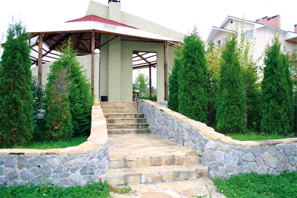 Ландшафт участка пейзажный, смещается в сторону спокойного, восточного стиля каменистых садиков. Эстетика японских садов – давнее увлечение хозяйки дома. Ландшафт формируют дорожки, вымощенные брусчаткой и плитняком, по которым можно пройти к различным зонам небольшого парка: садовой, прогулочной, зоне отдыха с небольшой беседкой и мостиком через водоем.