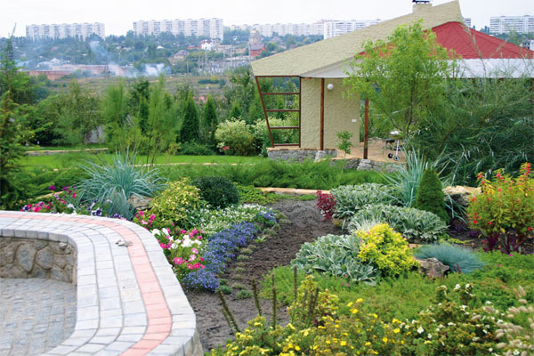 На пологом протяженном склоне разместились беседка, пышные ягодные кустарники и клумбы, а также водоем.