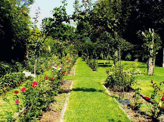 Сад и парковая зона расположены в двух уровнях. Верхняя зона усадьбы – ландшафтная, с огромными природными водопадами, речушками, озерами, старинной водяной мельницей. Нижняя территория усадьбы имеет регулярный и плодовый сад, растут здесь и цитрусовые деревья. Прекрасные плоды лимонов и апельсинов являются украшением сада. Из семечковых плодовых деревьев здесь успешно выращивают яблони и груши, а косточковые представлены замечательными сливами, как сортовыми, так и декоративными.