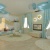 Детская предусмотрена для двух малышей, имеет зоны сна, учебную и игровую. Комната просторная и светлая, основной цвет стен бело-молочный, украшенный большими и маленькими звездочками, тематическими и развивающими картинками. Вся мебель расположена вдоль стен, а в центре много места для игр: на коврике столик для творчества и место, где можно посмотреть любимые мультики и учебные передачи, на полу розетка-галактика с радужными планетами, кресло-качеля. Всевозможные шкафчики, полочки, ящички для хранения, вещей, игрушек, книг.