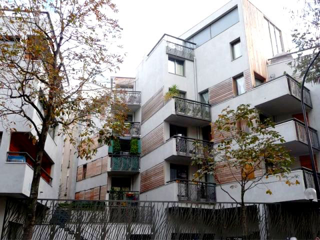 7. Ясли-детсад (на первом этаже) и 13 муниципальных квартир (2009) с оригинальной деревянной обшивкой фасада архитекторов Люка Пу и Элизабет Но.